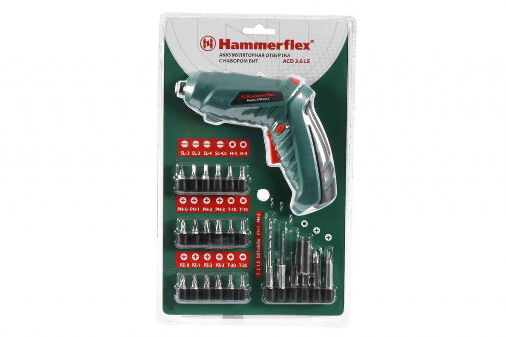 Главная страница » Каталог товаров » Электроинструмент HAMMER » Аккум.отвертка Hammer Flex ACD3.6LE с набором бит 3,6В 0,6Ач 2.8Нм Ni-Cd